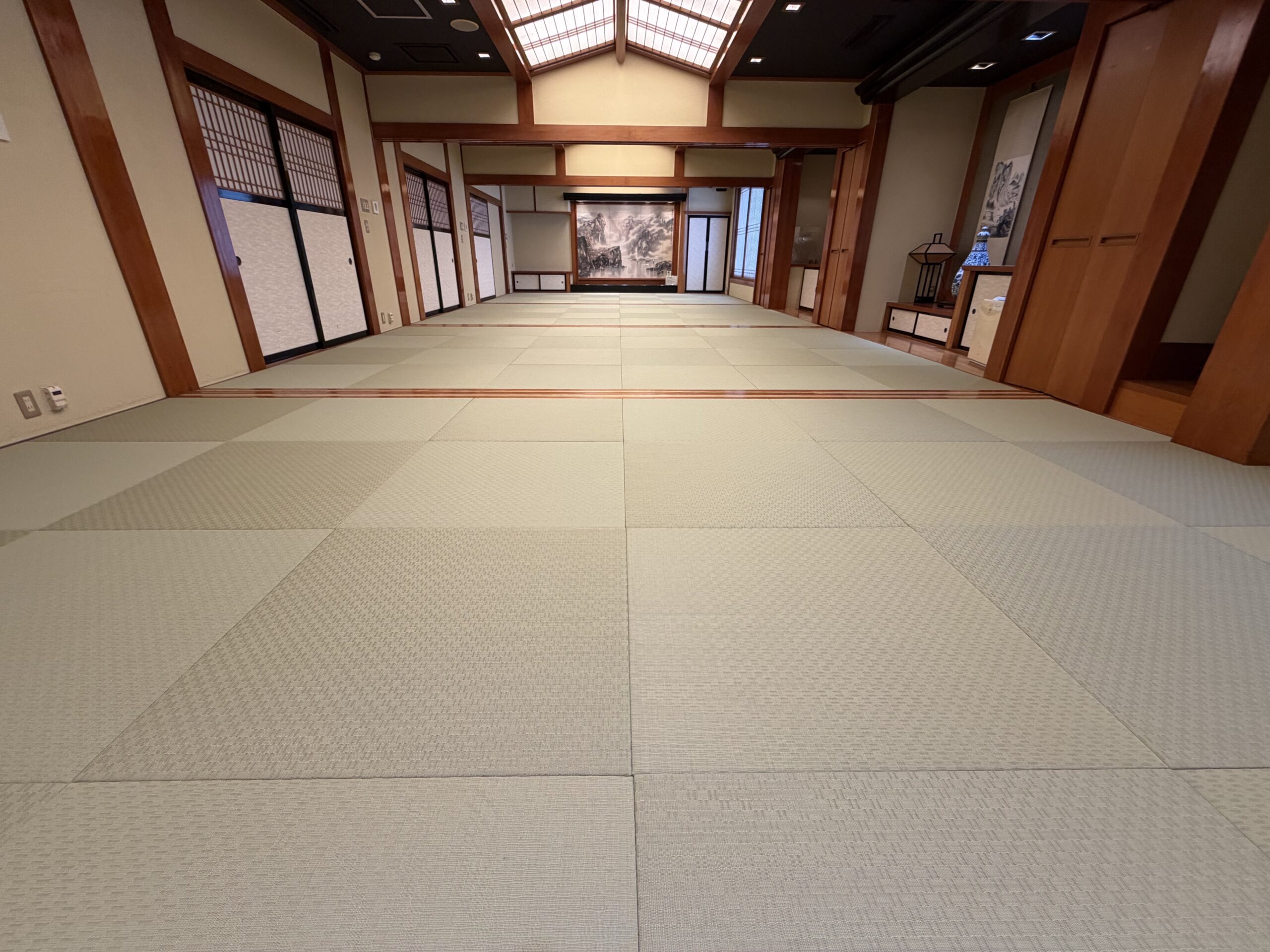 「波奈 本店」様の2階広間の畳を交換させていただきました。今回は縁無し畳を採用。仕切りの襖を外した際、視界を遮るラインがなくなることで、より開放感あふれる広々とした空間になりました。